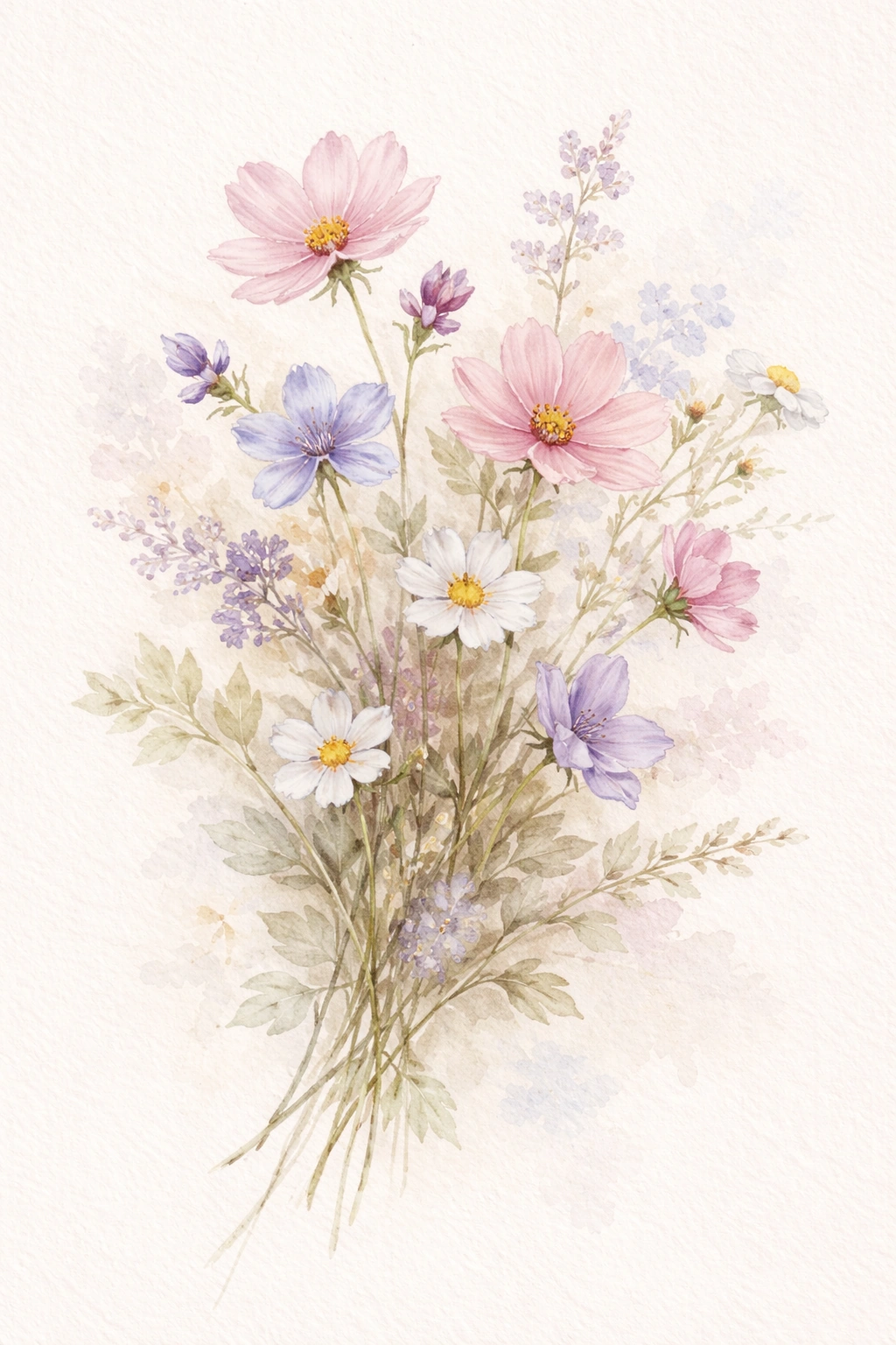 Hand-painted watercolor botanical illustration of delicate wildflowers, soft pastel color palette, textured paper background, light brush strokes, elegant artistic composition.