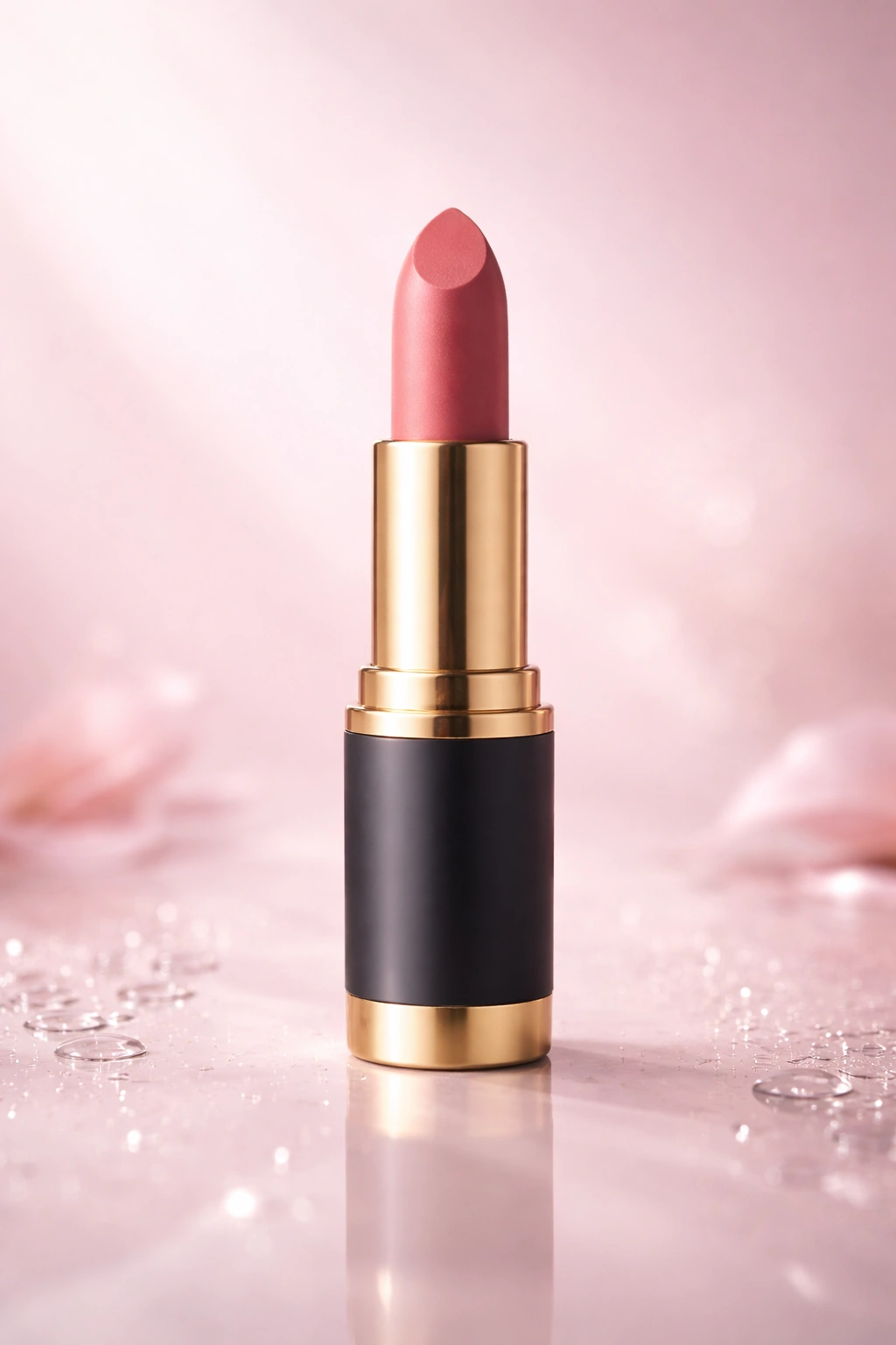 Close-up premium matte lipstick standing upright on reflective surface, soft pink gradient background, glowing beauty lighting, clean minimal aesthetic, luxury cosmetics advertisement, ultra-detailed product textures, 4K beauty campaign.