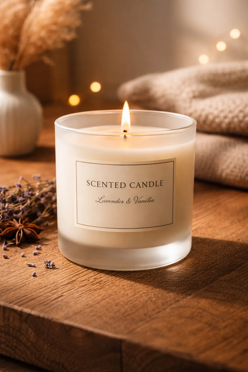 Elegant scented candle placed on wooden surface with warm ambient lighting, soft shadow, cozy modern home aesthetic, minimal Scandinavian style, premium lifestyle commercial photography, high-detail textures, warm branding tone.