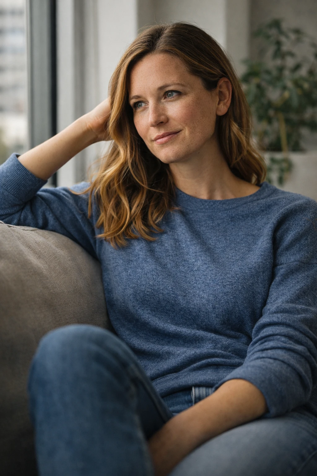 Portrait-oriented lifestyle image of the same person indoors, candid moment, relaxed posture, soft window light illuminating the subject, realistic colors, authentic everyday photography style.