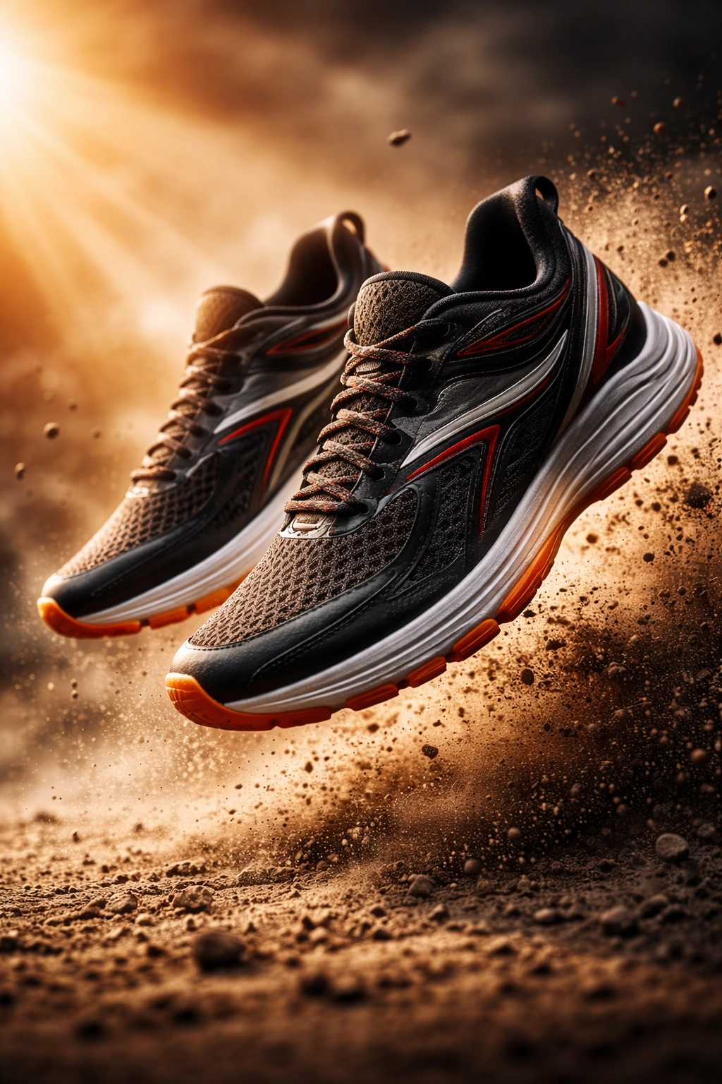 High-performance running shoes captured mid-air with dust particles and motion blur background, sunrise lighting, dynamic action energy, bold commercial sports campaign style, hyper-detailed textures, premium fitness advertisement aesthetic.