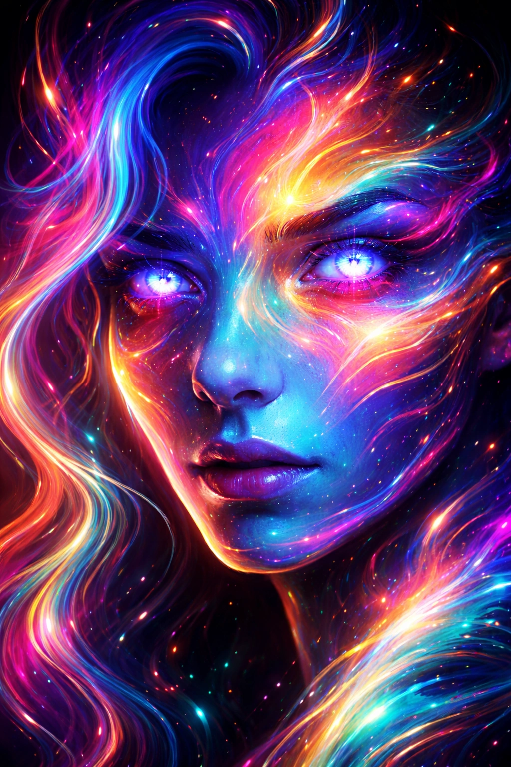 Psychedelic portrait with swirling neon colors blending across the face, fluid paint transitions, surreal glow effects, high-contrast vibrant composition, modern digital art style.