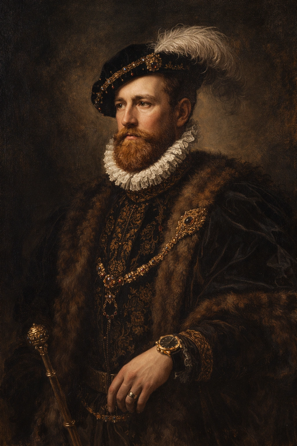 Detailed Renaissance-style oil painting portrait of a noble figure, dramatic chiaroscuro lighting, rich textures, classical European art style, subtle modern accessory detail, museum-quality realism.