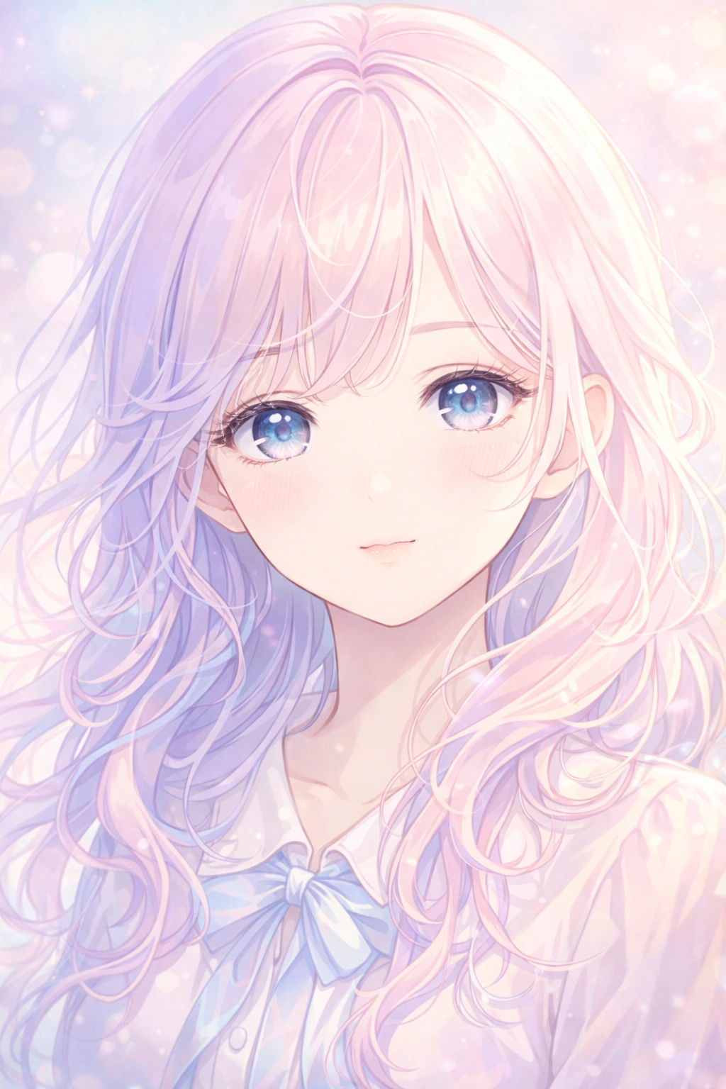 Soft pastel anime-style portrait of character with gentle lighting, delicate facial features, flowing hair, dreamy color palette, clean digital illustration style, high-detail shading.