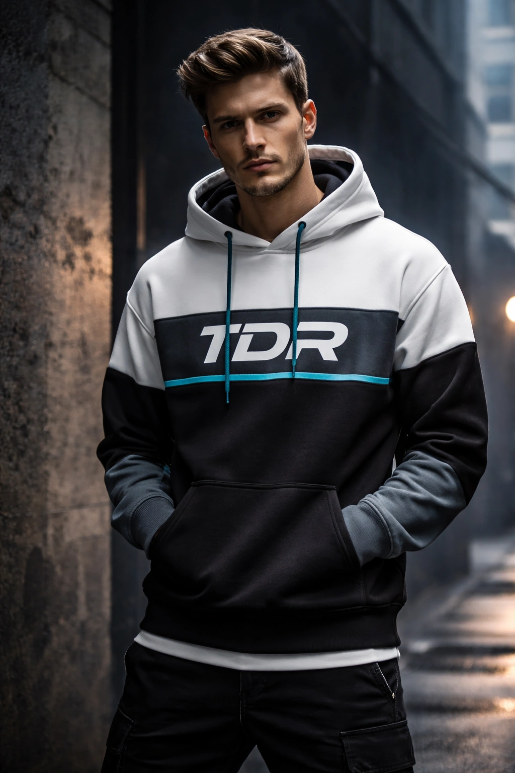 Modern streetwear hoodie worn by model in urban alley, dramatic side lighting, cool-toned cinematic mood, textured concrete background, high-fashion commercial photography, Instagram-ready campaign style.