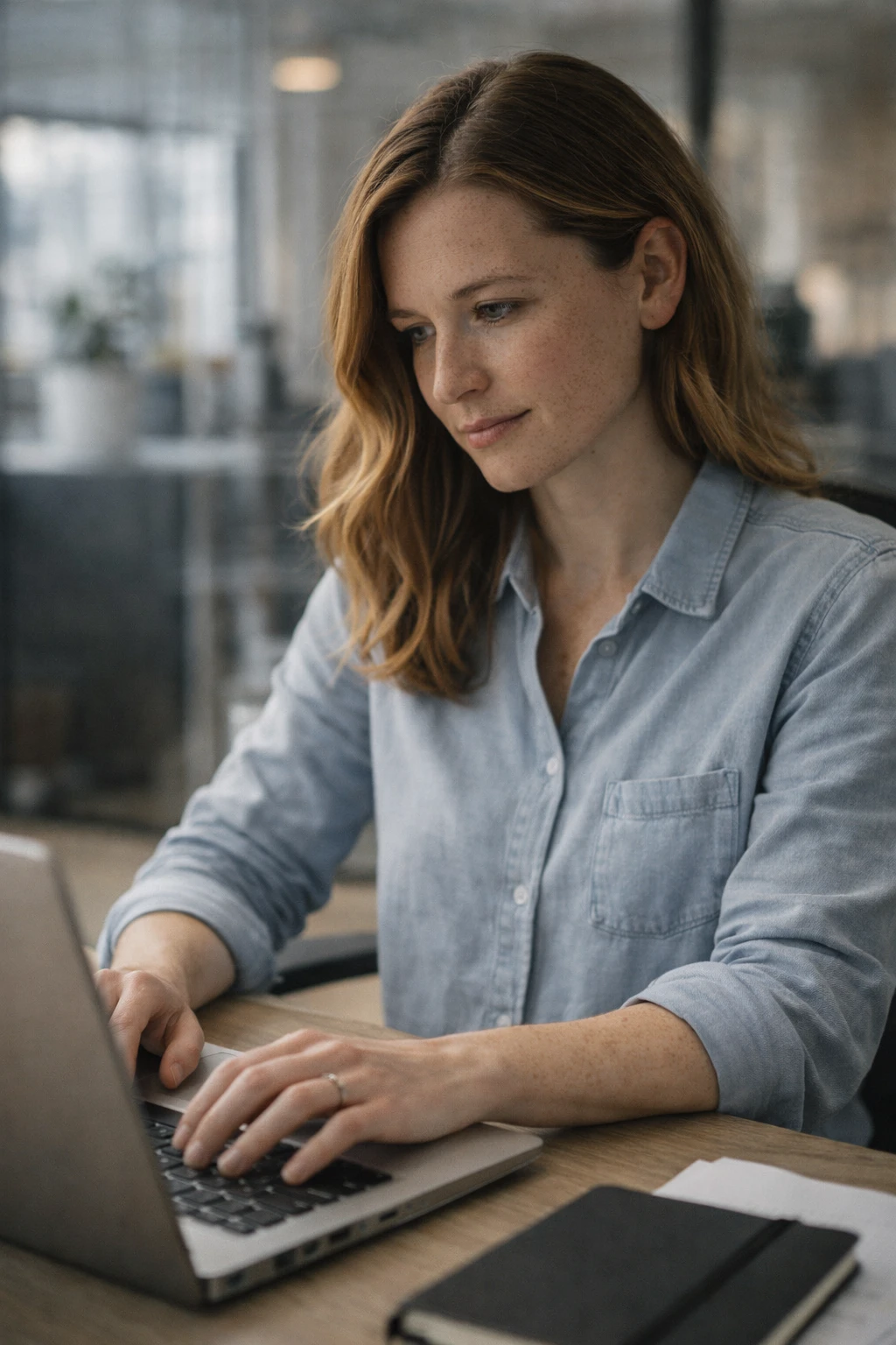 Portrait-oriented work-in-action image of the same person using a laptop at a desk, candid angle, professional environment, natural indoor lighting, realistic lifestyle photography.