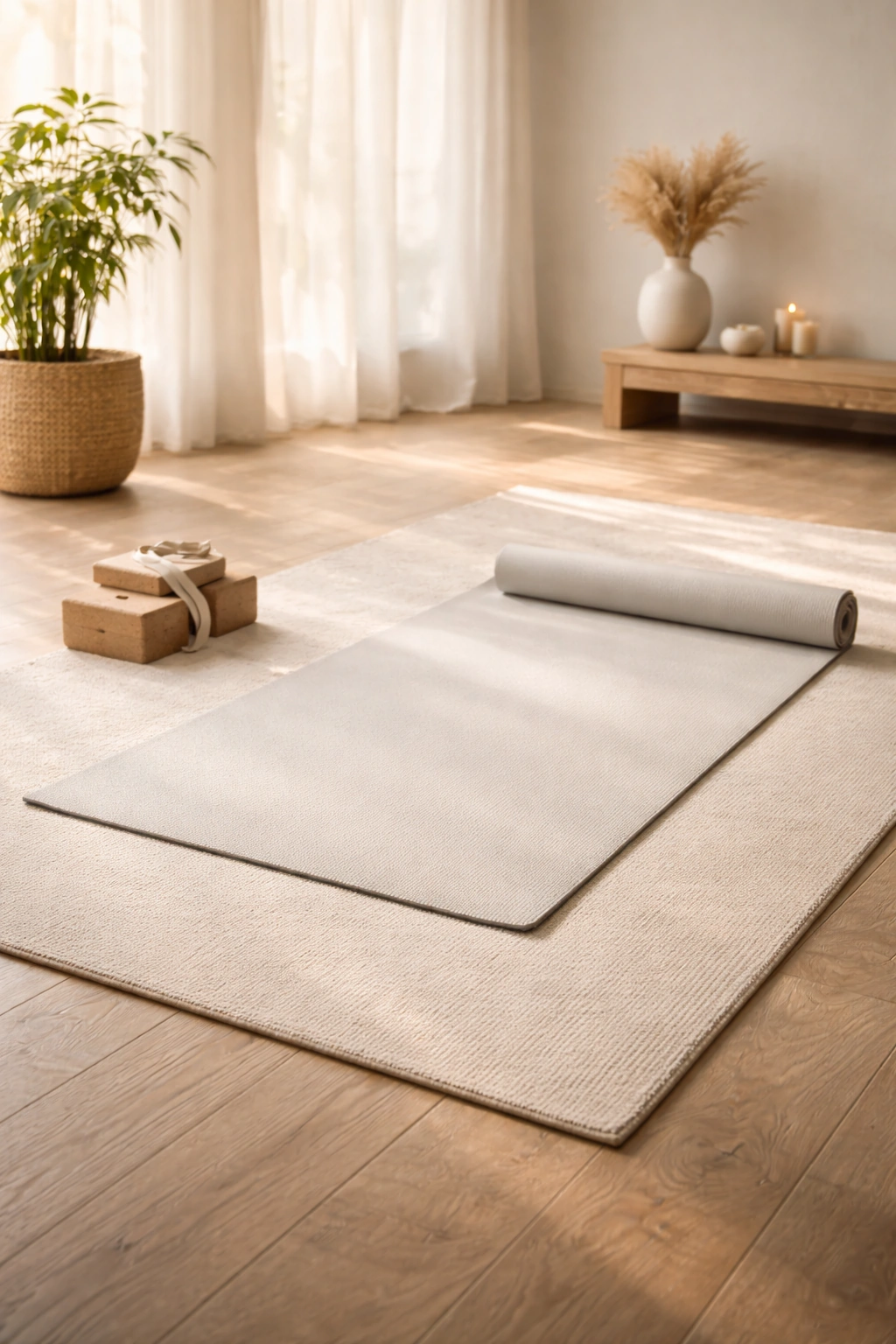 Yoga mat placed in serene minimal studio with soft morning sunlight streaming in, neutral color palette, peaceful wellness aesthetic, clean lifestyle commercial photography, high-detail texture, calm branding tone.
